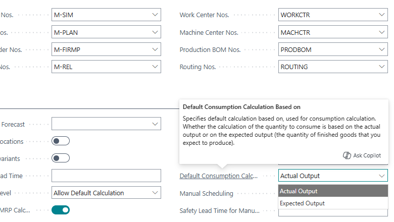 Pour spécifier ce que vous souhaitez que l’état Calculer la consommation affiche par défaut, accédez à la page Paramètres production puis, dans le champ Calcul de la consommation par défaut basé sur, sélectionnez Production prévue ou Production réelle