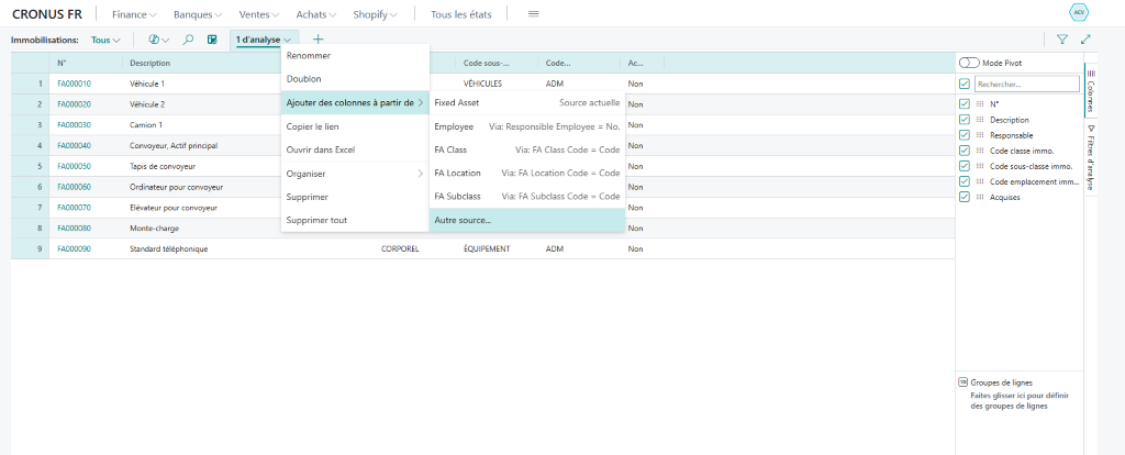 • À partir du menu contextuel Ajouter des colonnes à partir de sur un onglet en mode Analyse. Les champs sont ainsi insérés en tant que nouvelles colonnes à la fin de la vue.