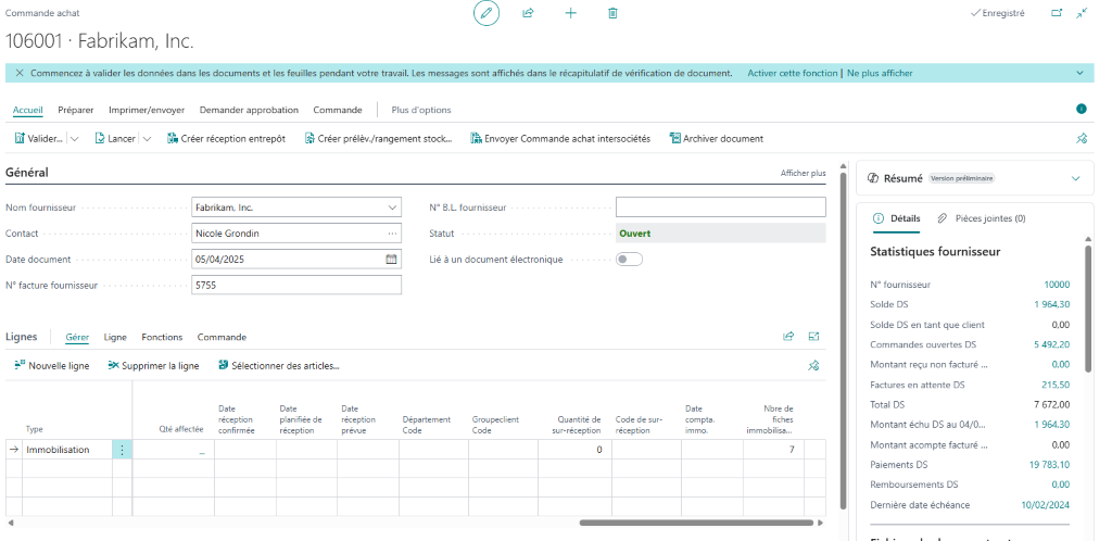 Cette fonctionnalité crée automatiquement plusieurs cartes d’immobilisations lorsque vous validez des factures d’achat. Par exemple, si votre entreprise achète 200 ordinateurs auprès du même fournisseur, Business Central génère automatiquement des cartes d’immobilisation pour chaque ordinateur. Vous n’avez pas besoin de créer les cartes manuellement.